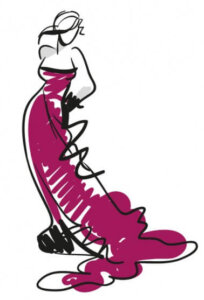 Byl to návrh Jeanne Lanvinové, přepracování modelu ušitého ve dvacátých letech pro italskou operní divu Ritu Cavalliniovou, avšak jeho obrovská mašle byla namísto tisíců perliček a skleněných křišťálů zdobena stovkami drobounkých poupátek růží ze zlatého hedvábí.