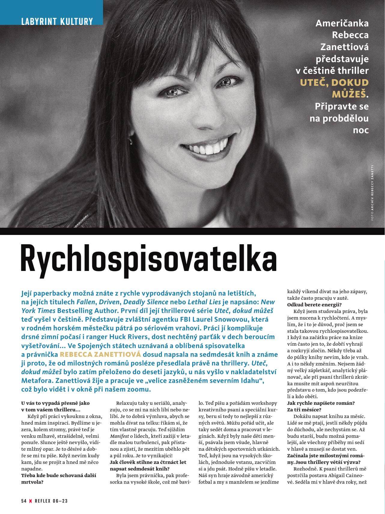 Přinášíme vám exkluzivní rozhovor s úspěšnou spisovatelkou Rebeccou Zanetti, autorkou mrazivého thrilleru Uteč, dokud můžeš. Článek vyšel v časopisu Reflex.